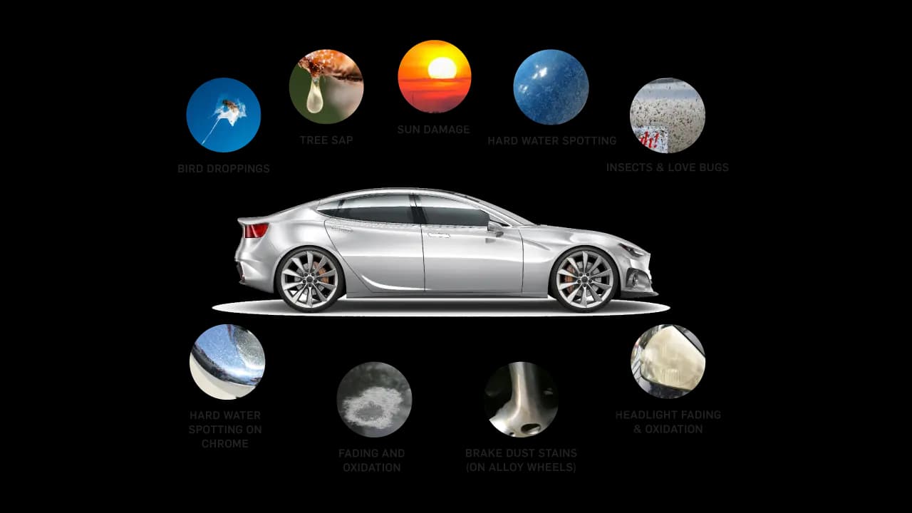 Exterior Protection is applied to the exterior surfaces of your vehicle and helps protect against environmental elements. Should covered surface damage occur, we will repair or replace the damaged area with zero out-of-pocket expense to you. Below are some items that exterior protection can help protect against.